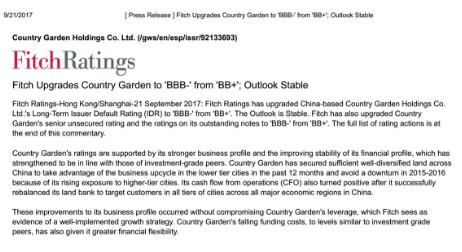 9月21日,国际三大权威信用评级机构之一的惠誉评级公司(Fitch)将碧桂园企业信用评级由BB+上调至投资级BBB-,评级展望稳定。与此同时,惠誉将碧桂园优先无担保票据的评级自BB+调升至BBB-。